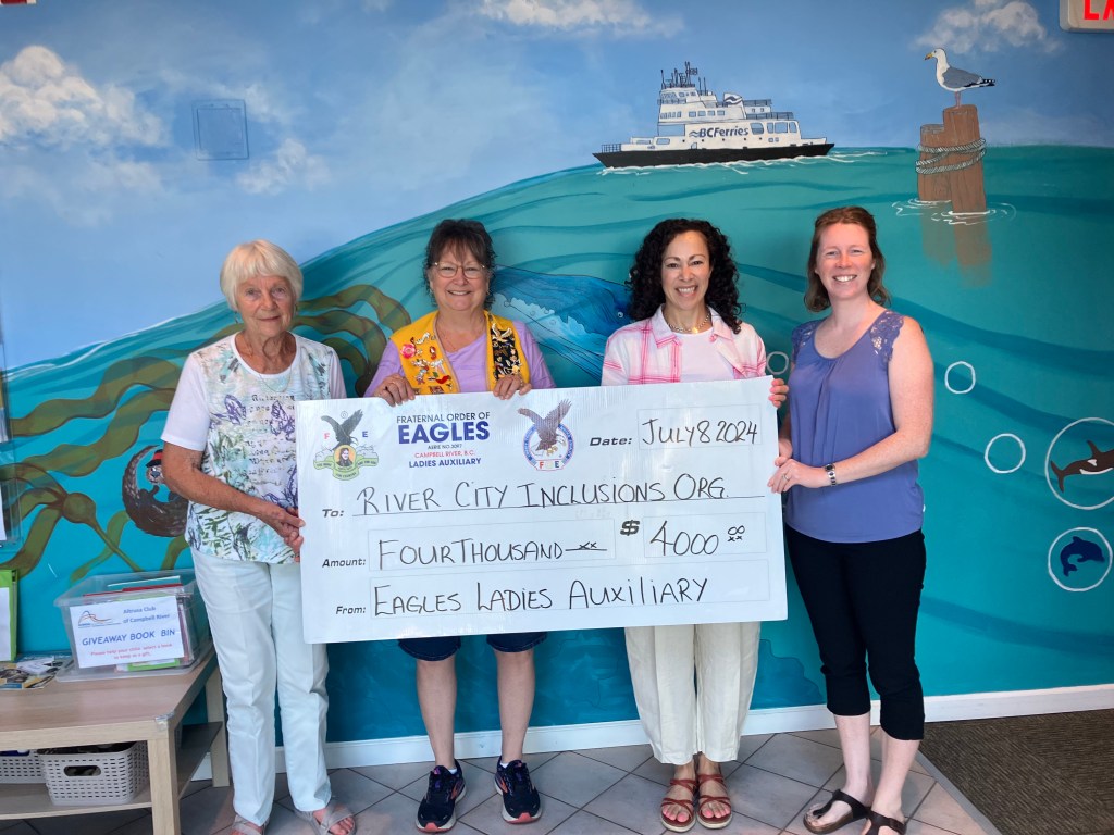 Campbell River Eagles #3097 donated a grant for $4,000 to Rivercity Inclusion, a non-profit organization advocating for services for people with special needs and their families. The grant is for Rivercity Inclusion’s Child and Youth Development Centre at Dogwood Place.