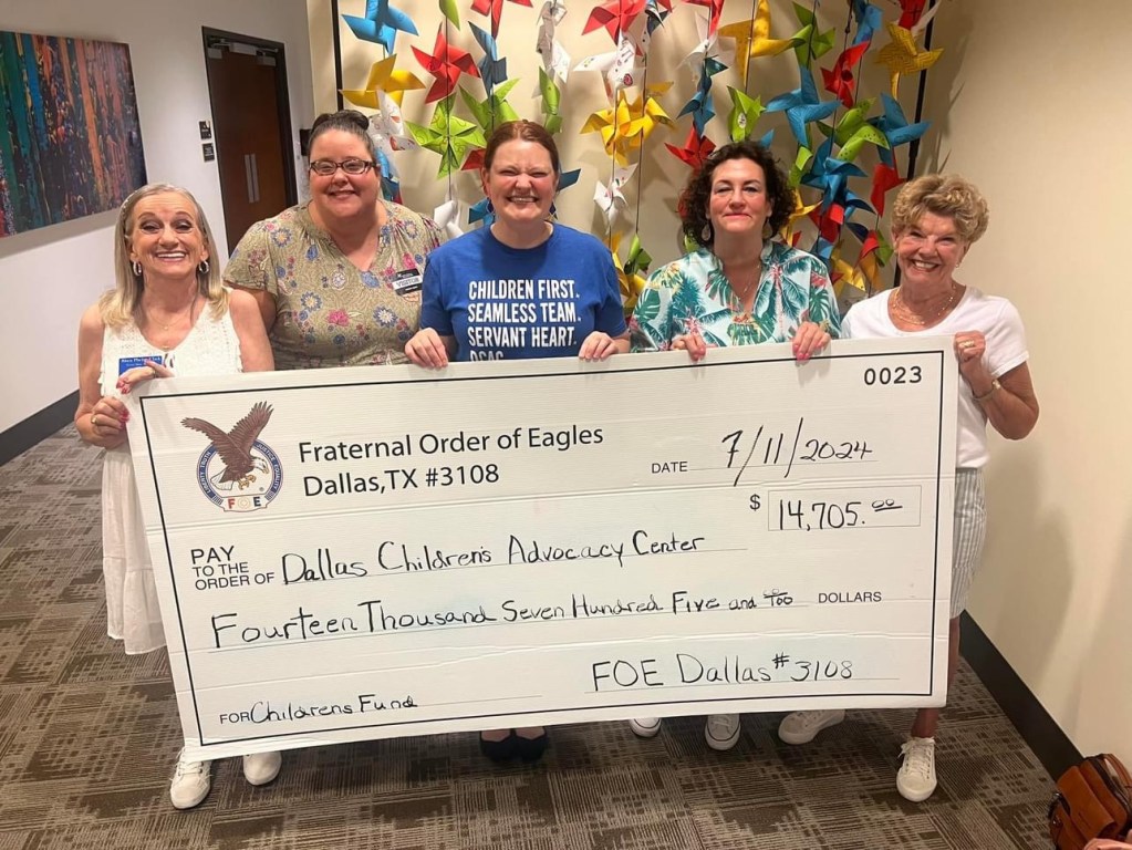 Dallas Eagles #3108 recently donated to Dallas Children’s Advocacy Center. DCAC helps children dealing with removal from unsafe living situations and the court system. The money was raised by Cecilia Bailey (far right). She has been raising money for this cause for 22 years, and has raised $225,000 over that time. Also pictured: 3108 members Rhea Phelan Clark, Linda Lance, Kristi Cochran, and DCAC representative Liz Robinson.