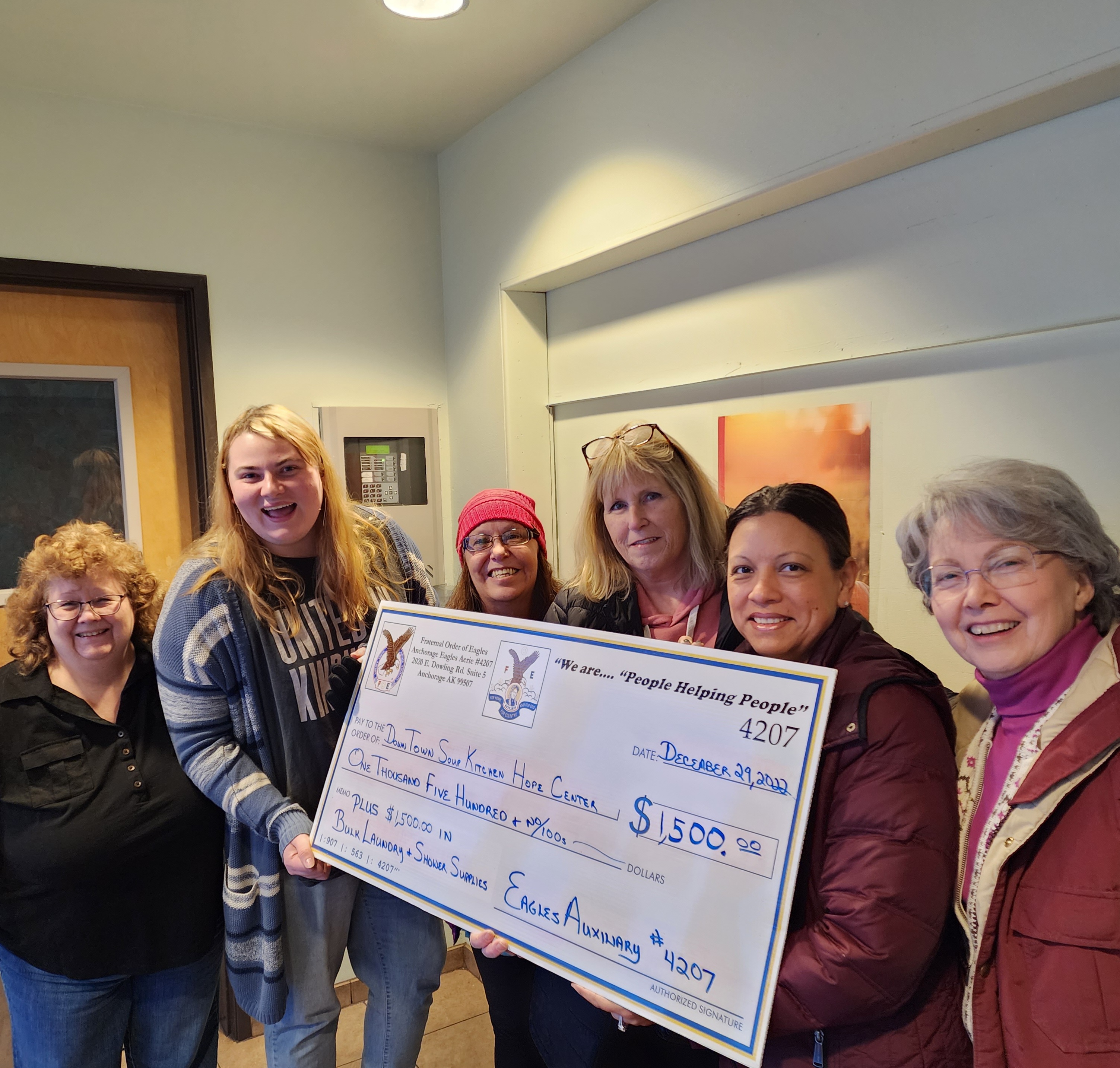 Anchorage Auxiliary #4207 recently donated $1,500 to the Downtown Soup Kitchen Hope Center along with $1,500 in bulk laundry and shower supplies.