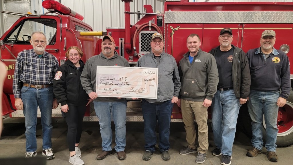 James River Eagles Aerie #2337 recently presented a check for $20,000 to the Jamestown Rural Fire Department for the purchase of a new pumper truck.