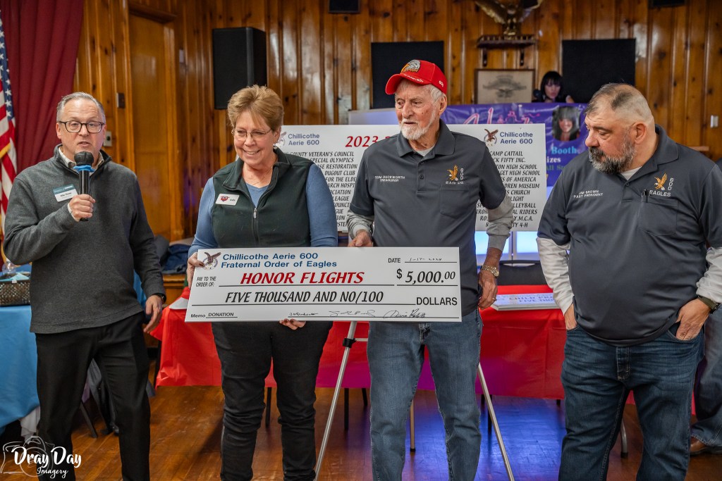 Chillicothe, Ohio Aerie 600 recently hosted the Chillicothe/Ross County Chamber of Commerce Monthly Business after Business (BAB) which is a net-working event held by various members of the Chamber for the purpose of promoting their business or organization. Some 150-business people and their employees attended on the cold January night of 1-17-24 at which time Aerie 600 presented seven (7) five (5) thousand-dollar checks ($5,000.00) to various 501©3 charitable organizations which included the following: Ross County Special Olympics, Honor Flights, Chillicothe Art League, St Judes Children’s Research, First Capital Enterprises, Ross County Senior Citizens Center, and the Child Protection Center. Pictured making the presentation to Honor Flight are left to right Chamber President and CEO Mike Throne, Southern Ohio Liaison for Honor Flight Columbus Jodie Augustine, Aerie Treasurer Tom Duckworth, and Past Aerie President Jim Brown Jr. It was announced that Aerie 600 Treasurer Tom Duckworth would on the next Honor Flight out of Columbus, Ohio. As always, the Eagles are “People Helping People.”