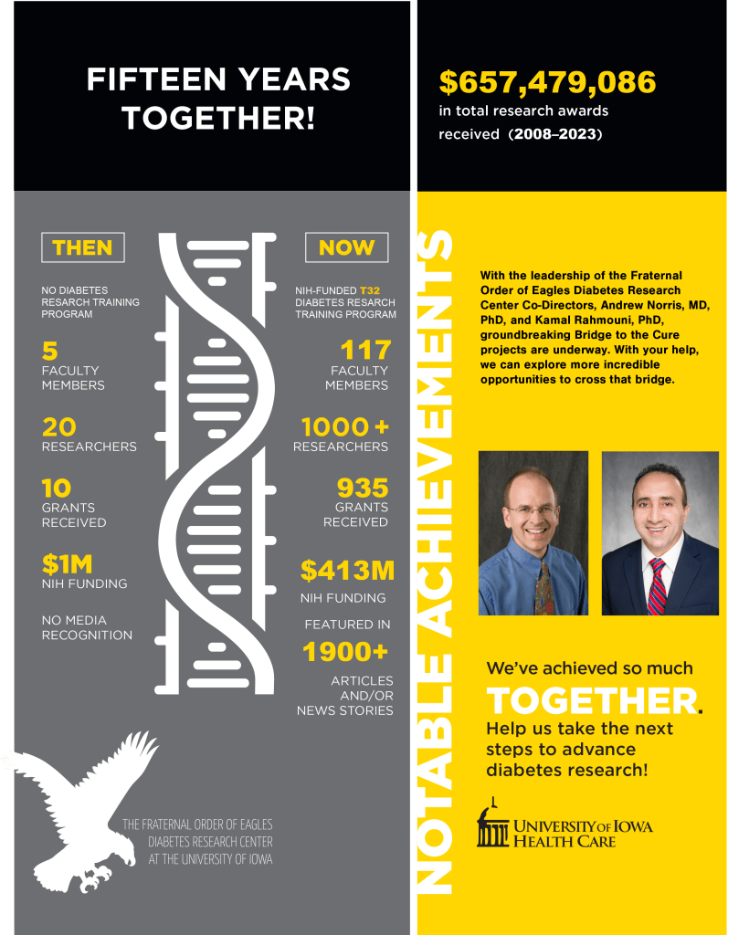 In 2008,The Fraternal Order of Eagles made a promise to help fin a cure for diabetes, pledging $25 million to fund research efforts at the F.O.E. Diabetes Research Center at the University of Iowa. Since then, our money has helped fund significant breakthroughs in the field of diabetes. Now, it’s time to bring those research efforts to the next level through the Bridge to the Cure.